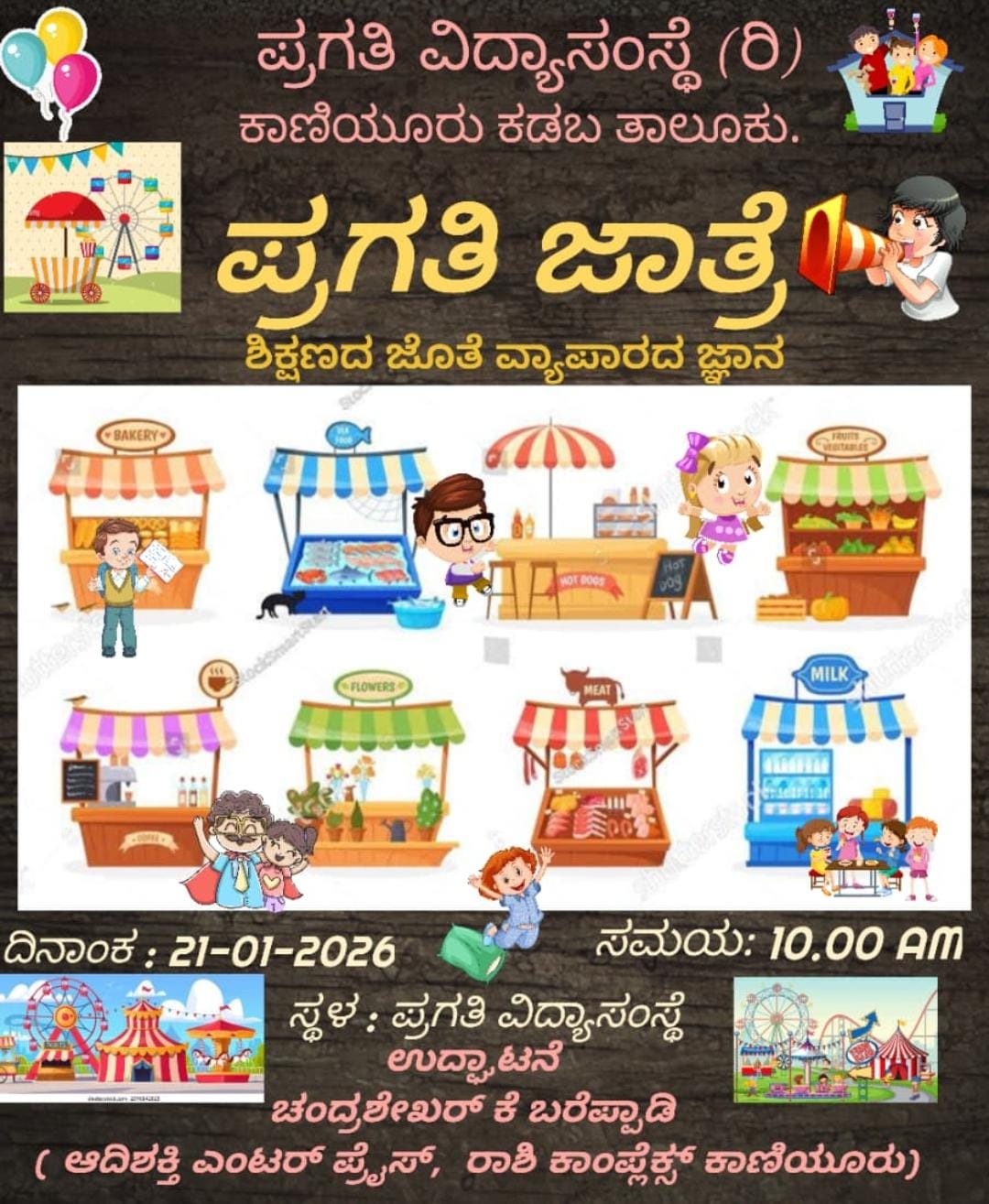 ಮಕ್ಕಳಿಗೆ ಶಿಕ್ಷಣದ ಜೊತೆಗೆ ವ್ಯಾಪಾರ ವ್ಯವಹಾರದ ಬಗ್ಗೆ ಜ್ಞಾನ ನೀಡುವ ಮೆಟ್ರಿಕ್ ಮೇಳ “ಪ್ರಗತಿ ಜಾತ್ರೆ” ದಿನಾಂಕ 21-01-2026ರ ಬುಧವಾರ ಕಾಣಿಯೂರು ಪ್ರಗತಿ ವಿದ್ಯಾಸಂಸ್ಥೆಯಲ್ಲಿ ನಡೆಯಲಿದೆ.ಕಾರ್ಯಕ್ರಮದ ಉದ್ಘಾಟನೆಯನ್ನು ಚಂದ್ರಶೇಖರ ಬರೆಪ್ಪಾಡಿ ಮಾಡಲಿದ್ದಾರೆ.ಮೇಳದಲ್ಲಿ ಮಕ್ಕಳೇ ವಿವಿಧ ರೀತಿಯ ವ್ಯಾಪಾರ ವ್ಯವಹಾರ ನಡೆಸಲಿದ್ದಾರೆ.