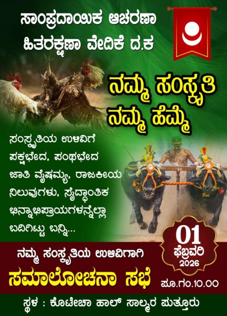 ಪುತ್ತೂರು: ತುಳುನಾಡಿನ ಸಾಂಪ್ರದಾಯಿಕ ಆಚರಣೆಗಳು ಹಾಗೂ ಜನಪದ ಕ್ರೀಡೆಗಳ ಸಂರಕ್ಷಣೆಗಾಗಿ “ಸಾಂಪ್ರದಾಯಿಕ ಆಚರಣಾ ಹಿತರಕ್ಷಣಾ ವೇದಿಕೆ ದ.ಕ” ವತಿಯಿಂದ ಫೆಬ್ರವರಿ 1ರಂದು ಪುತ್ತೂರಿನಲ್ಲಿ ಬೃಹತ್ ಸಮಾಲೋಚನಾ ಸಭೆ ಆಯೋಜಿಸಲಾಗಿದೆ.