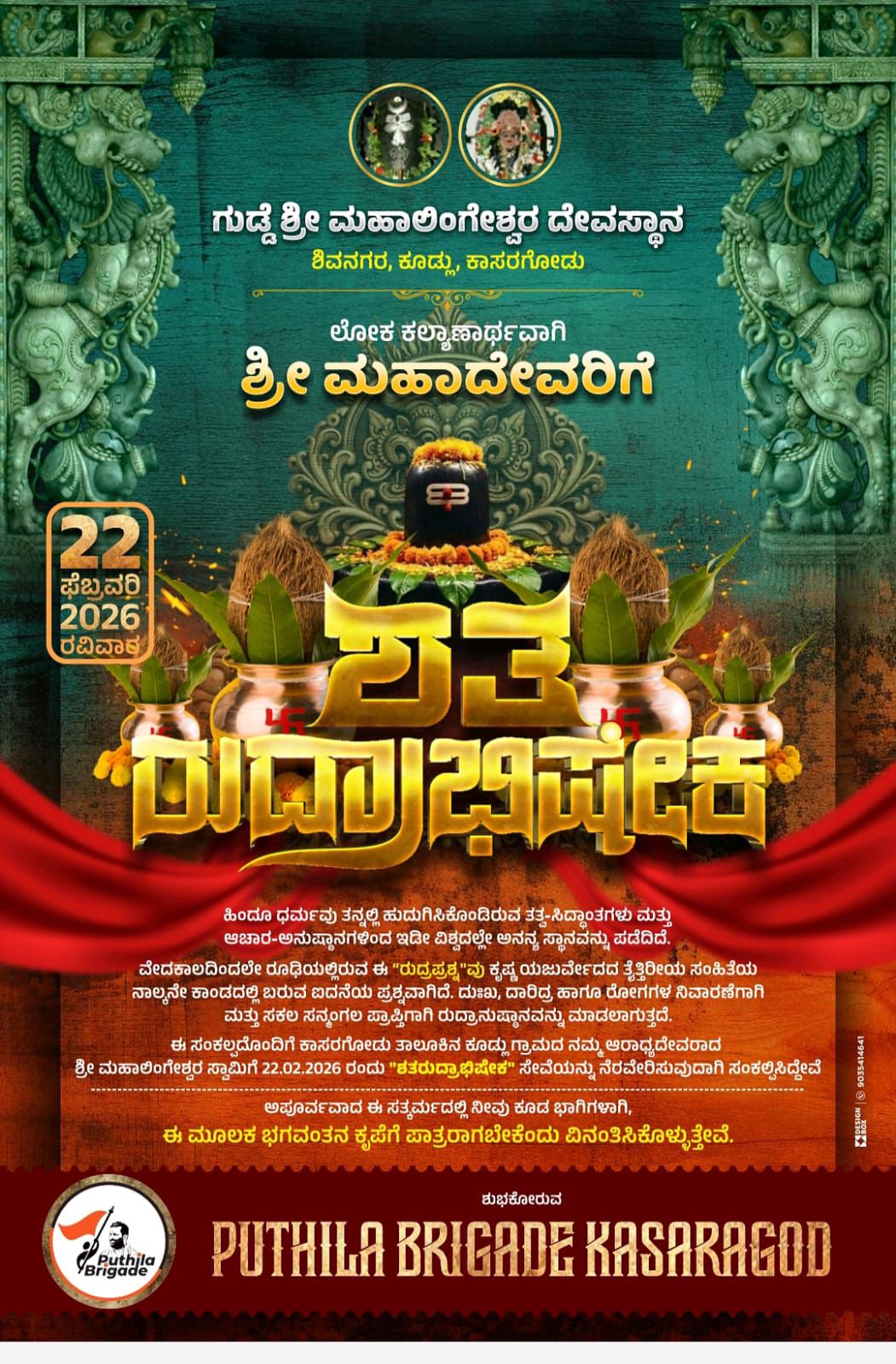 ಕಾಸರಗೋಡು: ತಾಲೂಕಿನ ಕೂಡ್ಲು ಗ್ರಾಮದ ಶಿವನಗರದಲ್ಲಿ ನೆಲೆಸಿರುವ ಆರಾಧ್ಯದೇವ ಶ್ರೀ ಮಹಾಲಿಂಗೇಶ್ವರ ದೇವಸ್ಥಾನದಲ್ಲಿ ಫೆಬ್ರವರಿ 22ರ ಭಾನುವಾರ ಮಹತ್ವದ ಧಾರ್ಮಿಕ ಕಾರ್ಯಕ್ರಮ ಆಯೋಜಿಸಲಾಗಿದೆ. ಲೋಕ ಕಲ್ಯಾಣದ ಉದ್ದೇಶದಿಂದ ಅಂದು ದೇವರಿಗೆ ಅದ್ದೂರಿಯಾಗಿ “ಶತರುದ್ರಾಭಿಷೇಕ” ಸೇವೆ ನೆರವೇರಲಿದೆ. ಹಿಂದೂ ಧರ್ಮದ ಸನಾತನ ತತ್ವಗಳ ಸಾರವನ್ನು ಒಳಗೊಂಡಿರುವ ಈ ಅನುಷ್ಠಾನವು ವೇದೋಕ್ತವಾಗಿ ಜರುಗಲಿದ್ದು, ಭಕ್ತಾದಿಗಳು ಪಾಲ್ಗೊಳ್ಳಲು ಸಮಿತಿ ವಿನಂತಿಸಿದೆ.