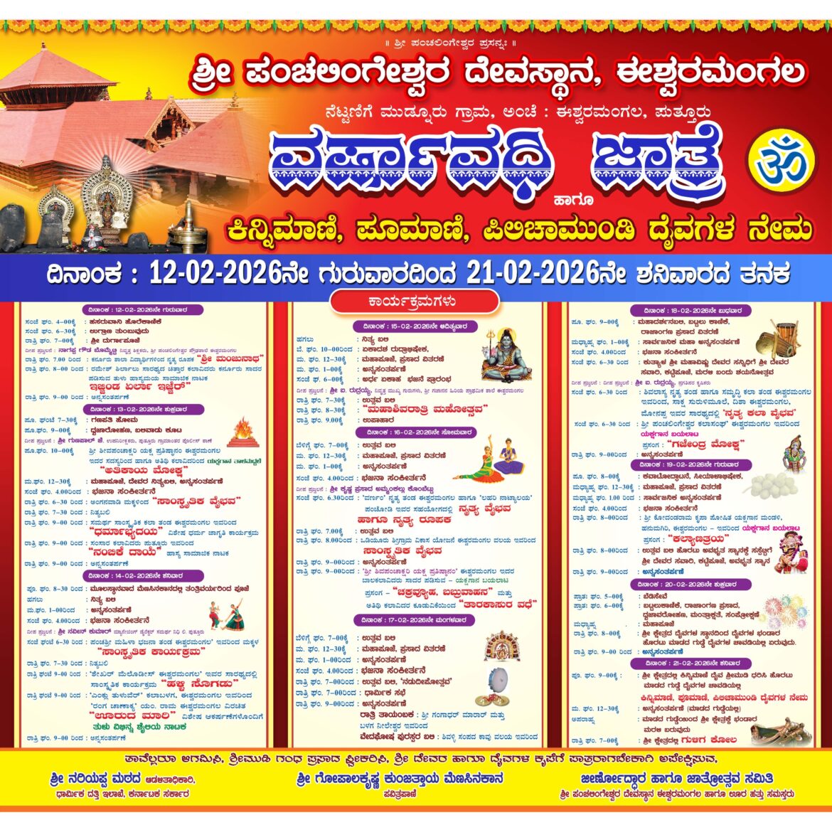 ಉತ್ಸವದ ಪ್ರಮುಖ ಘಟ್ಟವಾಗಿ ಫೆಬ್ರವರಿ 18ರಂದು ಮಹಾದರ್ಶನ ಬಲಿ, ಬಟ್ಟಲು ಕಾಣಿಕೆ ಹಾಗೂ ಅವಭೃತ ಸ್ನಾನ ನಡೆಯಲಿದೆ. ಫೆಬ್ರವರಿ 20ರಂದು ಧ್ವಜಾವರೋಹಣ ನೆರವೇರಲಿದ್ದು, ಫೆಬ್ರವರಿ 21ರಂದು ಕಿನ್ನಿಮಾಣಿ, ಪೂಮಾಣಿ ಹಾಗೂ ಪಿಲಿಚಾಮುಂಡಿ ದೈವಗಳ ನೇಮೋತ್ಸವ ಮತ್ತು ಗುಳಿಗ ಕೋಲದೊಂದಿಗೆ ಜಾತ್ರೋತ್ಸವ ಸಂಪನ್ನಗೊಳ್ಳಲಿದೆ. ಭಕ್ತಾದಿಗಳು ಹೆಚ್ಚಿನ ಸಂಖ್ಯೆಯಲ್ಲಿ ಪಾಲ್ಗೊಂಡು ದೇವರ ಹಾಗೂ ದೈವಗಳ ಕೃಪೆಗೆ ಪಾತ್ರರಾಗಬೇಕೆಂದು ದೇವಸ್ಥಾನದ ಆಡಳಿತ ಮಂಡಳಿ ಮತ್ತು ಜಾತ್ರೋತ್ಸವ ಸಮಿತಿ ವಿನಂತಿಸಿದೆ.