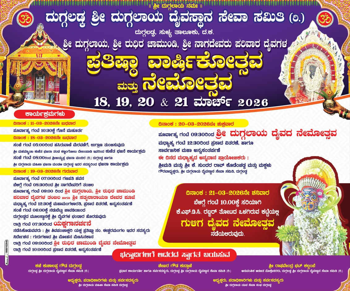 ದುಗ್ಗಲಡ್ಕ ಶ್ರೀ ದುಗ್ಗಲಾಯ ದೈವಸ್ಥಾನದ ಪ್ರತಿಷ್ಠಾ ವಾರ್ಷಿಕೋತ್ಸವ: ಮಾರ್ಚ್ 18ರಿಂದ ಸಾಂಸ್ಕೃತಿಕ ಸಂಭ್ರಮ