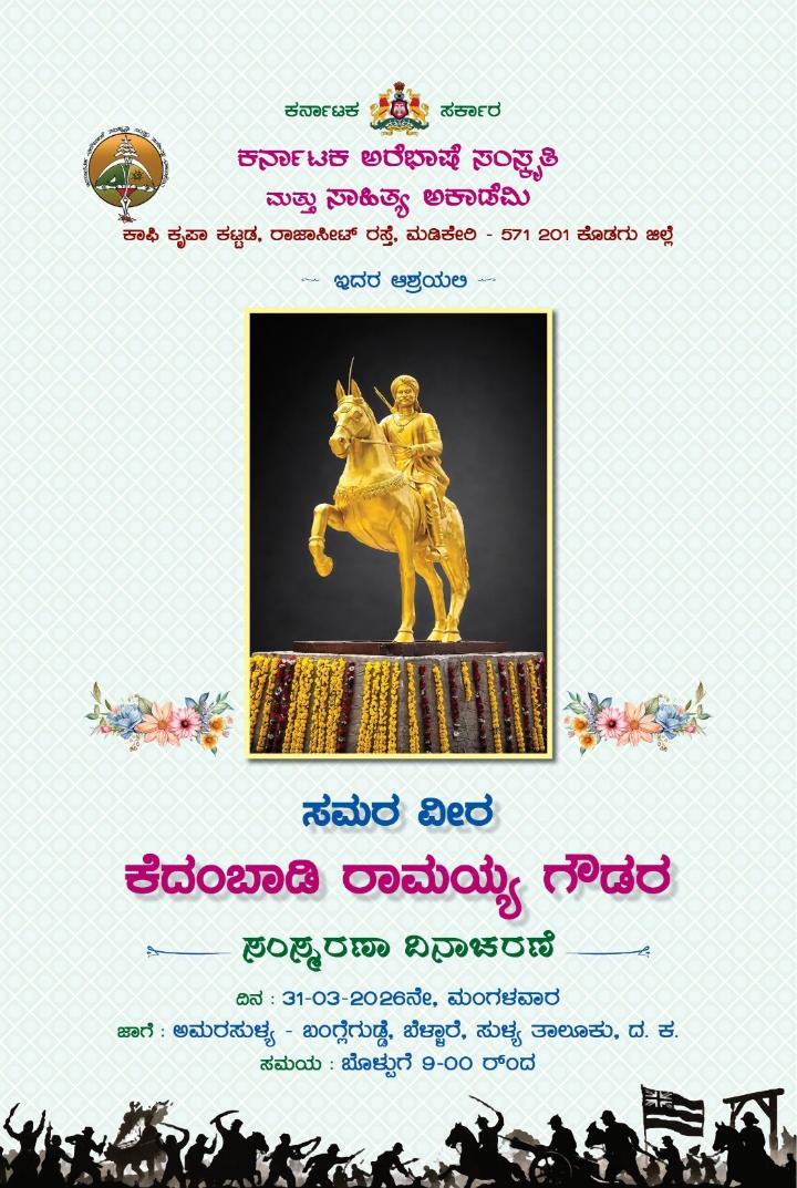 ಕರ್ನಾಟಕ ಅರೆಭಾಷೆ ಸಂಸ್ಕ್ರತಿ ಮತ್ತು ಸಾಹಿತ್ಯ ಅಕಾಡೆಮಿ ಇದರ ಆಶ್ರಯದಲ್ಲಿ ಮಾರ್ಚ್ 31 2026 ನೇ ಮಂಗಳವಾರ ಬೆಳಗ್ಗೆ 9 ಗಂಟೆಯಿಂದ ಬೆಳ್ಳಾರೆಯ ಬಂಗ್ಲೆಗುಡ್ಡೆಯಲ್ಲಿ ನಡೆಯಲಿದೆ.