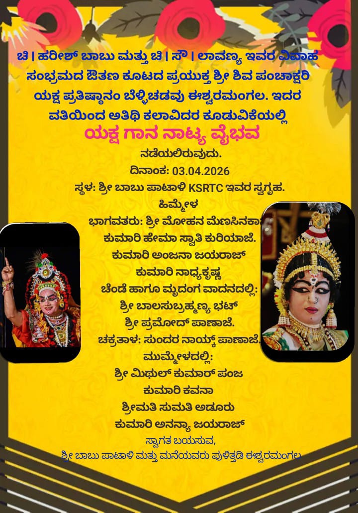 ಈಶ್ವರಮಂಗಲ: ಏಪ್ರಿಲ್ 3ರಂದು ಹರೀಶ್ ಬಾಬು ಮತ್ತು ಲಾವಣ್ಯ ಅವರ ವಿವಾಹದ ಪ್ರಯುಕ್ತ ‘ಯಕ್ಷಗಾನ ನಾಟ್ಯ ವೈಭವ’