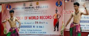 ಸುಳ್ಯ: ನೆಹರೂ ಮೆಮೋರಿಯಲ್ ಕಾಲೇಜಿನ ವಿದ್ಯಾರ್ಥಿಯೊಬ್ಬರು ಕೂಚುಪುಡಿ ನೃತ್ಯದ ಮೂಲಕ ವಿಶ್ವ ದಾಖಲೆ ಸಾಧನೆಗೆ ಹೆಜ್ಜೆ ಹಾಕಿದ್ದು, ಗಮನ ಸೆಳೆಯುತ್ತಿದ್ದಾರೆ.