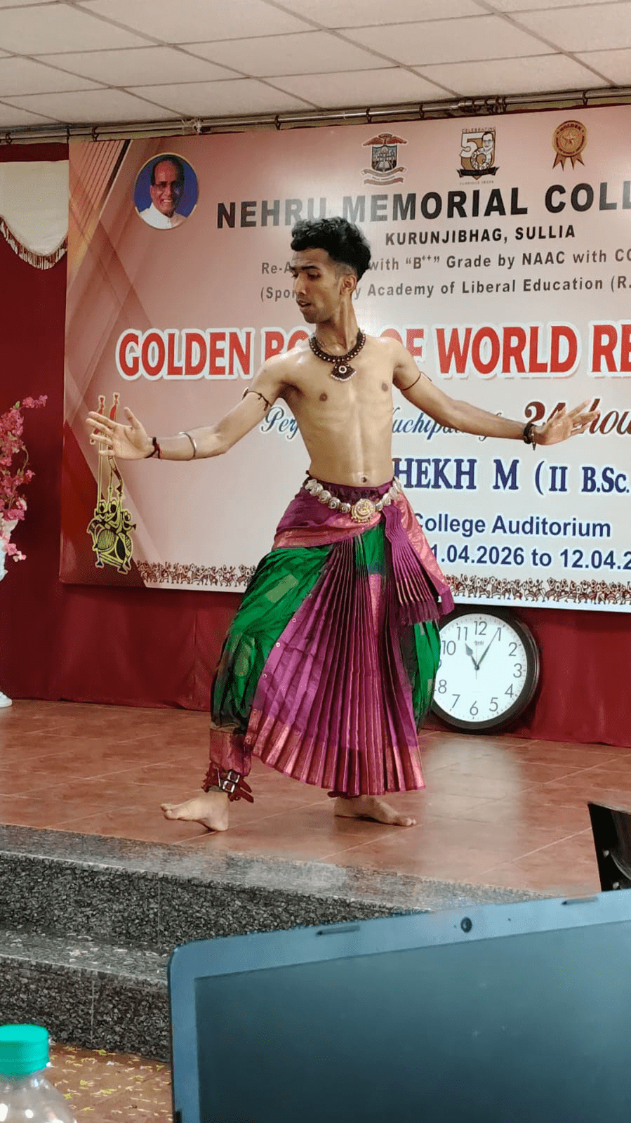 ದ್ವಿತೀಯ ಬಿಎಸ್ಸಿ ವಿದ್ಯಾರ್ಥಿ ಅಭಿಷೇಕ್ ಕಣೆಮರಡ್ಕ ಅವರು ನಿರಂತರ 24 ಗಂಟೆಗಳ ಕೂಚುಪುಡಿ ನೃತ್ಯ ಪ್ರದರ್ಶನದ ಮೂಲಕ ಗೋಲ್ಡನ್ ಬುಕ್ ಆಫ್ ವರ್ಲ್ಡ್ ರೆಕಾರ್ಡ್ ಸೇರುವ ಗುರಿ ಹೊಂದಿದ್ದಾರೆ. ಈ ನೃತ್ಯ ಪ್ರದರ್ಶನವು ಈಗಾಗಲೇ 18 ಗಂಟೆಗಳ ಕಾಲ ಯಶಸ್ವಿಯಾಗಿ ಮುಂದುವರಿದಿದೆ.