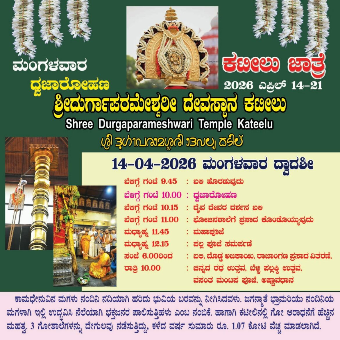 ಕಟೀಲು ಶ್ರೀ ದುರ್ಗಾಪರಮೇಶ್ವರೀ ದೇವಸ್ಥಾನದ ವಾರ್ಷಿಕ ಜಾತ್ರೋತ್ಸವಕ್ಕೆ ನಾಳೆ ಚಾಲನೆ: ಏ.14 ರಂದು ಧ್ವಜಾರೋಹಣ