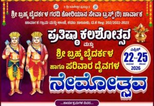 ಚಾರ್ವಾಕದಲ್ಲಿ ಎ.22ರಿಂದ 25ರವರೆಗೆ ಶ್ರೀ ಬ್ರಹ್ಮ ಬೈದರ್ಕಳ ಗರಡಿಯ ಪ್ರತಿಷ್ಠಕಲಶೋತ್ಸವ ಮತ್ತು ನೇಮೋತ್ಸವದ ವೈಭವ