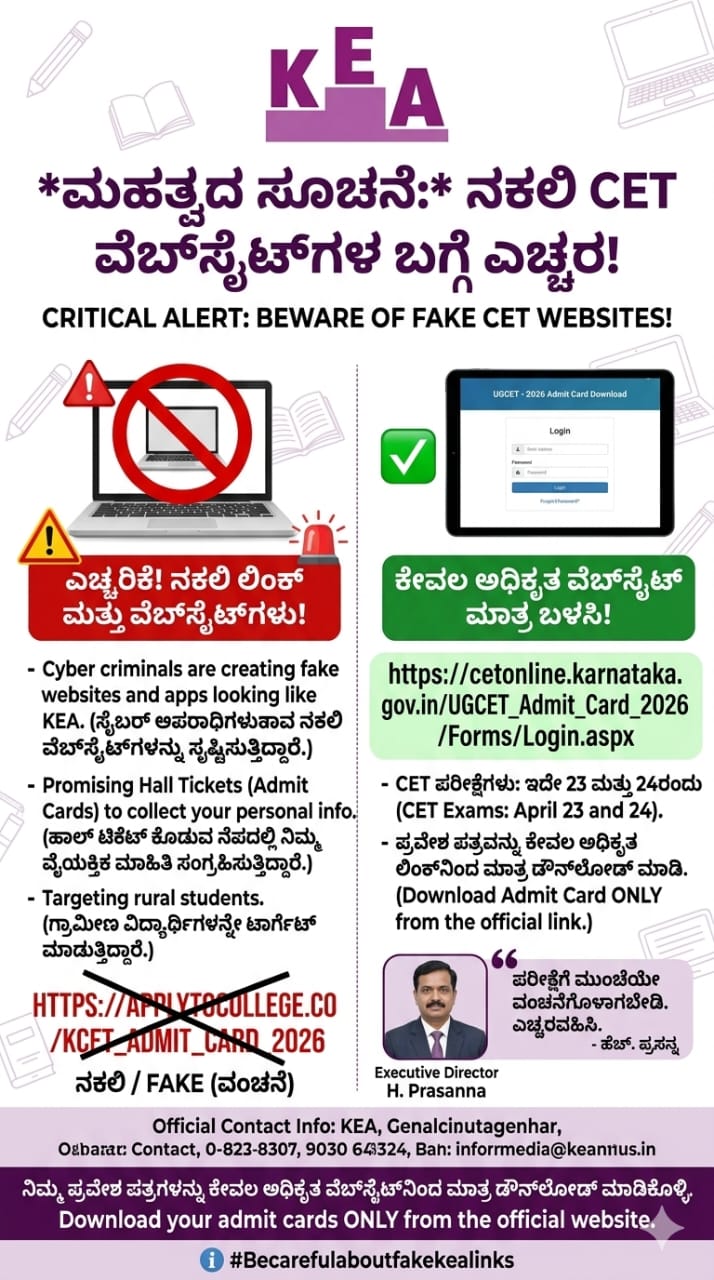ಕರ್ನಾಟಕ ಪರೀಕ್ಷಾ ಪ್ರಾಧಿಕಾರ (KEA) CET ವಿದ್ಯಾರ್ಥಿಗಳಿಗೆ ನಕಲಿ ವೆಬ್ಸೈಟ್ಗಳ ಬಗ್ಗೆ ಎಚ್ಚರಿಕೆ ನೀಡಿದೆ. ಪ್ರವೇಶ ಪತ್ರ ಡೌನ್ಲೋಡ್ ಹೆಸರಿನಲ್ಲಿ ಸೈಬರ್ ವಂಚಕರು ನಿಮ್ಮ ವೈಯಕ್ತಿಕ ಮಾಹಿತಿ ಸಂಗ್ರಹಿಸುತ್ತಿದ್ದಾರೆ. ಹೀಗಾಗಿ ವಿದ್ಯಾರ್ಥಿಗಳು ಅಧಿಕೃತ ವೆಬ್ಸೈಟ್ನಿಂದ ಮಾತ್ರ ತಮ್ಮ ಪ್ರವೇಶ ಪತ್ರಗಳನ್ನು ಡೌನ್ಲೋಡ್ ಮಾಡಿಕೊಳ್ಳಬೇಕು ಎಂದು ಕರ್ನಾಟಕ ಪರೀಕ್ಷಾ ಪ್ರಾಧಿಕಾರದ ಕಾರ್ಯನಿರ್ವಾಹಕ ನಿರ್ದೇಶಕ ಹೆಚ್.ಪ್ರಸನ್ನ ತಿಳಿಸಿದ್ದಾರೆ.