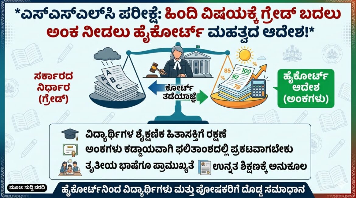 ಎಸ್ಎಸ್ಎಲ್ಸಿ ಹಿಂದಿ ಪರೀಕ್ಷೆಯಲ್ಲಿ ಅಂಕಗಳ ಬದಲಿಗೆ ಗ್ರೇಡ್ ನೀಡಲು ಮುಂದಾಗಿದ್ದ ಕರ್ನಾಟಕ ಸರ್ಕಾರದ ನಿರ್ಧಾರಕ್ಕೆ ಹೈಕೋರ್ಟ್ ತಡೆಯೊಡ್ಡಿದೆ. ಸರ್ಕಾರದ ನಿರ್ಧಾರದಿಂದ ವಿದ್ಯಾರ್ಥಿಗಳಿಗೆ ತೊಂದರೆಯಾಗಬಹುದು ಎಂದಿರುವ ಕೋರ್ಟ್, ಅಂಕಗಳನ್ನು ಕಡ್ಡಾಯವಾಗಿ ಫಲಿತಾಂಶದಲ್ಲಿ ಪ್ರಕಟಿಸುವಂತೆ ನಿರ್ದೇಶನ ನೀಡಿದೆ.