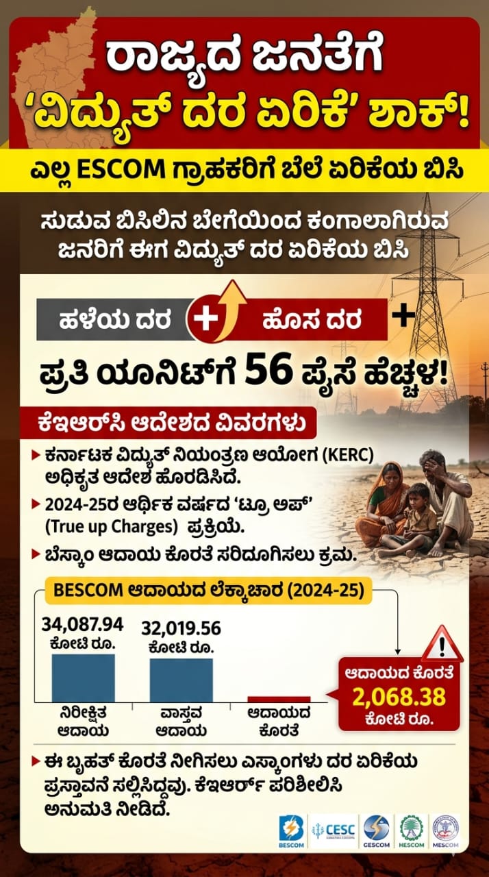 ಸುಡುವ ಬಿಸಿಲಿನ ಬೇಗೆಯಿಂದ ಕಂಗಾಲಾಗಿರುವ ರಾಜ್ಯದ ಜನರಿಗೆ ವಿದ್ಯುತ್ (ಎಲ್ಲಾ ಎಸ್ಕಾಂಗಳು-ESCOM) ಗ್ರಾಹಕರಿಗೆ ಈಗ ಬೆಲೆ ಏರಿಕೆಯ ಬಿಸಿ ತಟ್ಟಿದೆ. ಕರ್ನಾಟಕ ವಿದ್ಯುತ್ ನಿಯಂತ್ರಣ ಆಯೋಗವು (KERC) ವಿದ್ಯುತ್ ದರವನ್ನು ಏರಿಕೆ ಮಾಡಿ ಅಧಿಕೃತ ಆದೇಶ ಹೊರಡಿಸಿದೆ. ಈ ಹೊಸ ಆದೇಶದನ್ವಯ ಪ್ರತಿ ಯೂನಿಟ್ ವಿದ್ಯುತ್ ಬಳಕೆಯ ಮೇಲೆ 56 ಪೈಸೆ ಹೆಚ್ಚುವರಿ ಹೊರೆಯನ್ನು ಗ್ರಾಹಕರು ಹೊರಬೇಕಾಗಿದೆ.