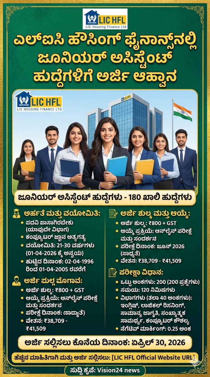 ದೇಶಾದ್ಯಂತ ಇರುವ ವಿವಿಧ ಶಾಖೆಗಳಲ್ಲಿ ಖಾಲಿ ಇರುವ ಜೂನಿಯರ್ ಅಸಿಸ್ಟೆಂಟ್ ಹುದ್ದೆಗಳ ಭರ್ತಿಗಾಗಿ ಎಲ್ಐಸಿ ಹೌಸಿಂಗ್ ಫೈನಾನ್ಸ್ ಲಿಮಿಟೆಡ್ (LIC HFL) ಅಧಿಸೂಚನೆ ಹೊರಡಿಸಿದೆ. ಈ ನೇಮಕಾತಿ ಪ್ರಕ್ರಿಯೆಯ ಮೂಲಕ ಒಟ್ಟು 180 ಹುದ್ದೆಗಳನ್ನು ಭರ್ತಿ ಮಾಡಲಾಗುತ್ತಿದ್ದು, ಪದವೀಧರ ಅಭ್ಯರ್ಥಿಗಳಿಗೆ ಇದು ಉತ್ತಮ ಅವಕಾಶವಾಗಿದೆ. ಆಸಕ್ತ ಮತ್ತು ಅರ್ಹ ಅಭ್ಯರ್ಥಿಗಳು ಏಪ್ರಿಲ್ 16, 2026 ರಿಂದ ಆನ್ಲೈನ್ ಮೂಲಕ ಅರ್ಜಿ ಸಲ್ಲಿಸಬಹುದಾಗಿದೆ.