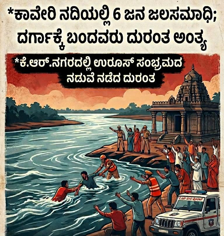 ಮೈಸೂರು ಜಿಲ್ಲೆಯ ಕೆ.ಆರ್.ನಗರದಲ್ಲಿ ಇಂದು ಉರೂಸ್ ಹಿನ್ನೆಲೆ ದರ್ಗಾಕ್ಕೆ ಬೆಂಗಳೂರು ಮತ್ತು ಊಟಿಯಿಂದ ಸಾಕಷ್ಟು ಸಂಖ್ಯೆಯಲ್ಲಿ ಜನರು ಆಗಮಿಸಿದ್ದರು. ಈ ಸಂದರ್ಭದಲ್ಲಿ ಎಂಟು ಜನರ ತಂಡವೊಂದು ಅರ್ಕೇಶ್ವರ ದೇವಸ್ಥಾನದ ಸಮೀಪವಿರುವ ಕಾವೇರಿ ನದಿಗೆ ಈಜಲು ತೆರಳಿದ್ದಾರೆ. ಈ ವೇಳೆ ನದಿಯಲ್ಲಿ ಮುಳುಗಿದ್ದಾರೆ. ತಕ್ಷಣವೇ ಕಾರ್ಯಪ್ರವೃತ್ತರಾದ ಸ್ಥಳೀಯರು ಇಬ್ಬರನ್ನು ರಕ್ಷಿಸುವಲ್ಲಿ ಯಶಸ್ವಿಯಾಗಿದ್ದಾರೆ. ಆದರೆ, ದುರದೃಷ್ಟವಶಾತ್ ಉಳಿದ ಆರು ಮಂದಿ ನೀರಿನಲ್ಲಿ ಮುಳುಗಿ ಮೃತಪಟ್ಟಿದ್ದಾರೆ.