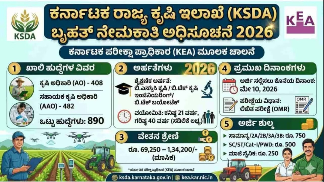 ಕರ್ನಾಟಕ ಕೃಷಿ ಇಲಾಖೆ (KSDA) ಮತ್ತು KEA ಮೂಲಕ 890 ಕೃಷಿ ಅಧಿಕಾರಿ (AO) ಮತ್ತು ಸಹಾಯಕ ಕೃಷಿ ಅಧಿಕಾರಿ (AAO) ಹುದ್ದೆಗಳಿಗೆ ಅರ್ಜಿ ಆಹ್ವಾನಿಸಿದೆ. ಕೃಷಿ ಪದವೀಧರರಿಗೆ ಇದೊಂದು ಸುವರ್ಣಾವಕಾಶ. ಉತ್ತಮ ವೇತನ ಶ್ರೇಣಿ ಹೊಂದಿರುವ ಈ ಹುದ್ದೆಗಳಿಗೆ ಮೇ 10ರೊಳಗೆ ಆನ್ಲೈನ್ನಲ್ಲಿ ಅರ್ಜಿ ಸಲ್ಲಿಸಬಹುದು.